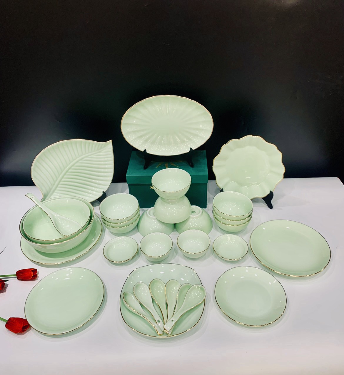 BỘ BÁT ĐĨA XANH NGỌC BÍCH CHỈ VÀNG 31 MÓN